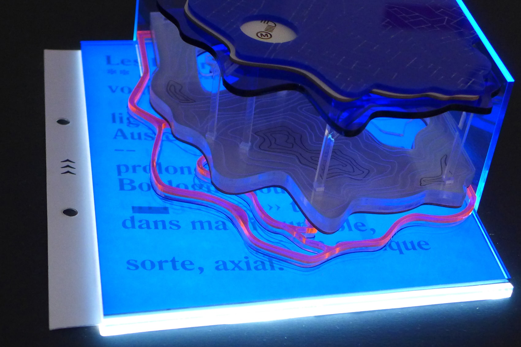 Plexiglass object made with the laser cutting, typographical sheets, instructions, stand in wood, 19 x 24 x 17 cm.